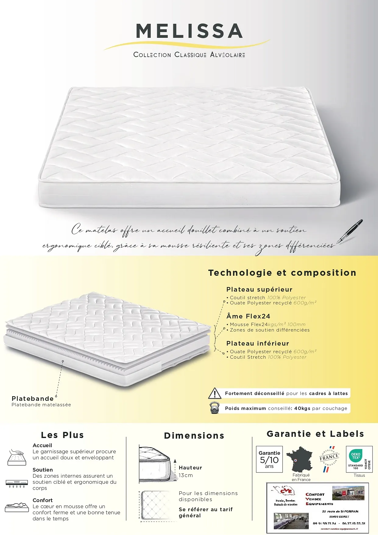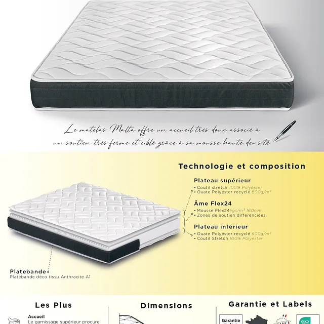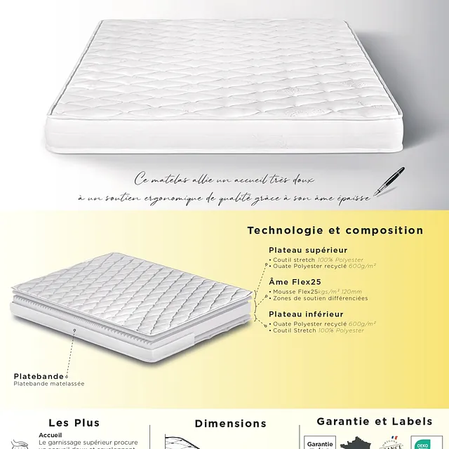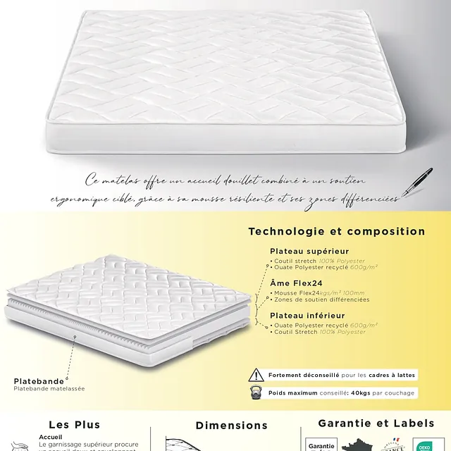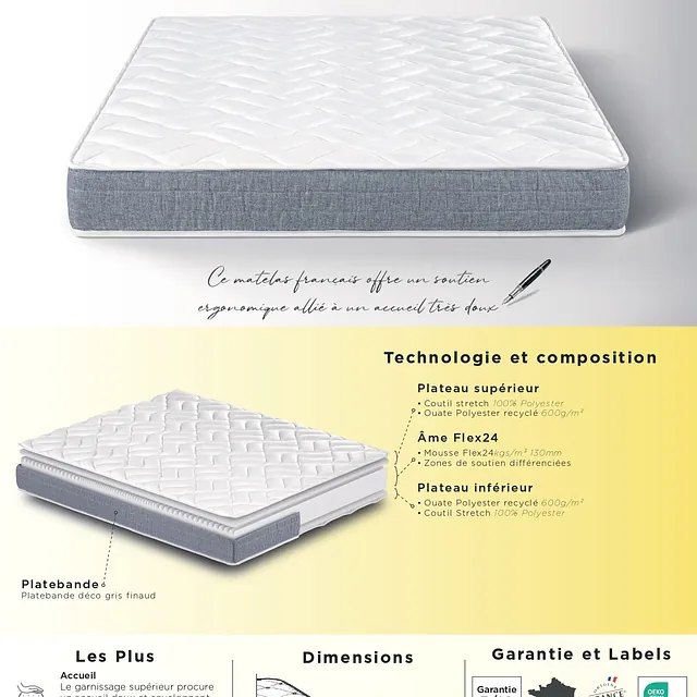 Âme de 13cm en mousse polyuréthane HDflex 24kgs/m³ ( ebac literie ) .