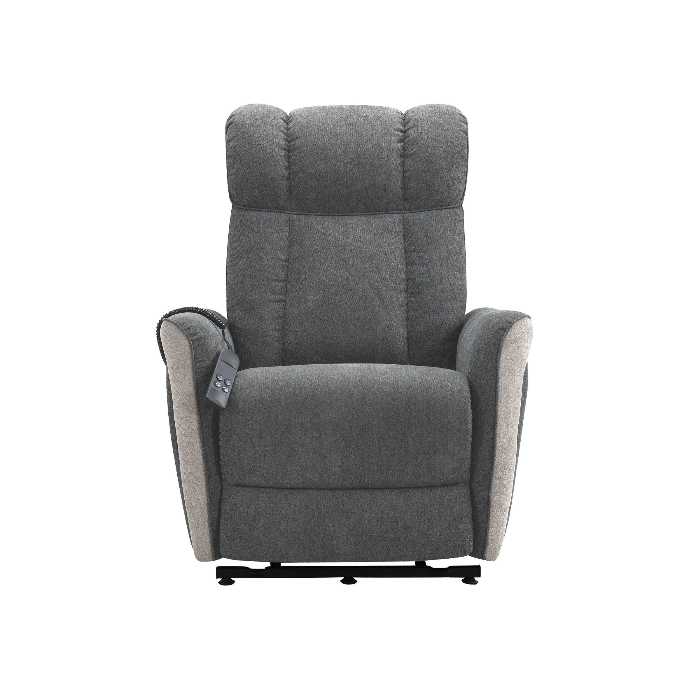 Fauteuil releveur, bi-moteur, microfibre ("velours ras"), adapté aux personnes à forte corpulence.