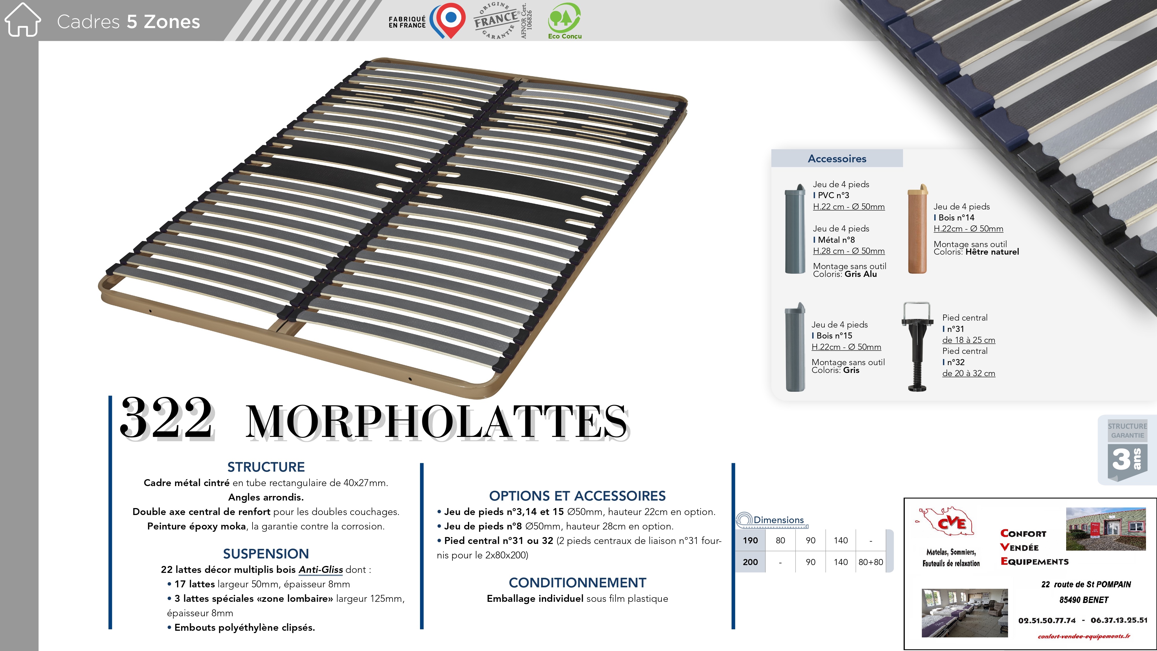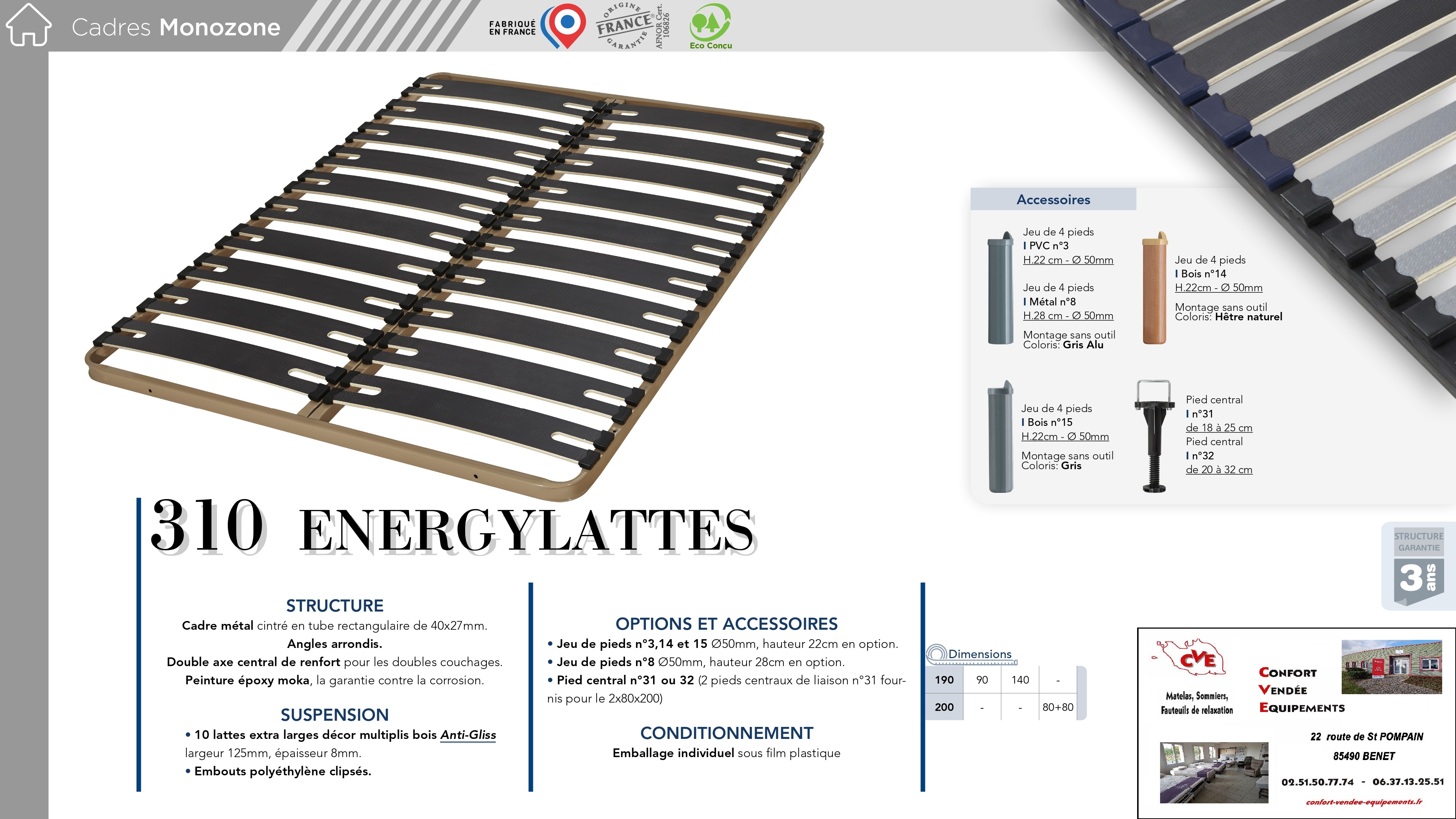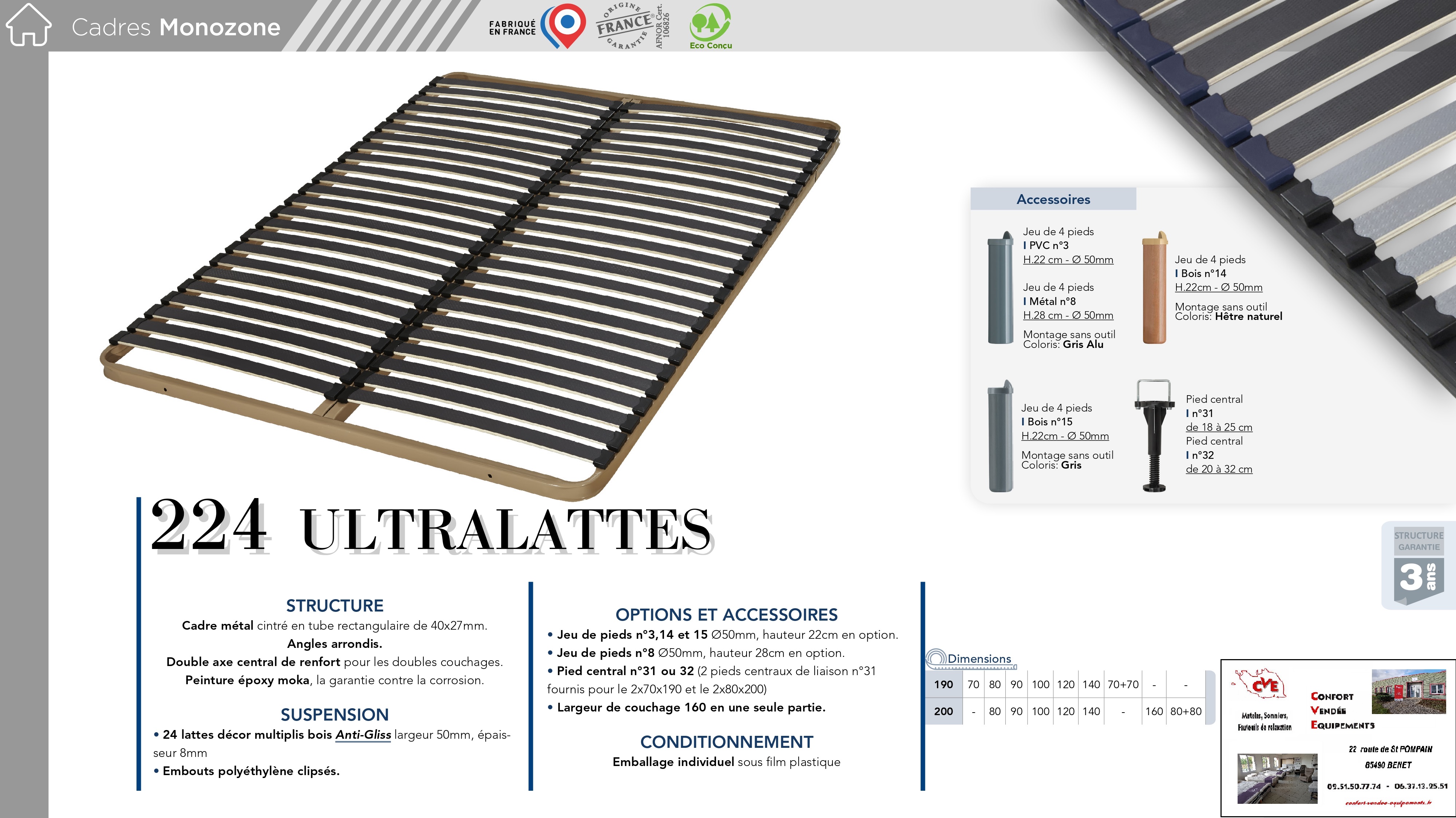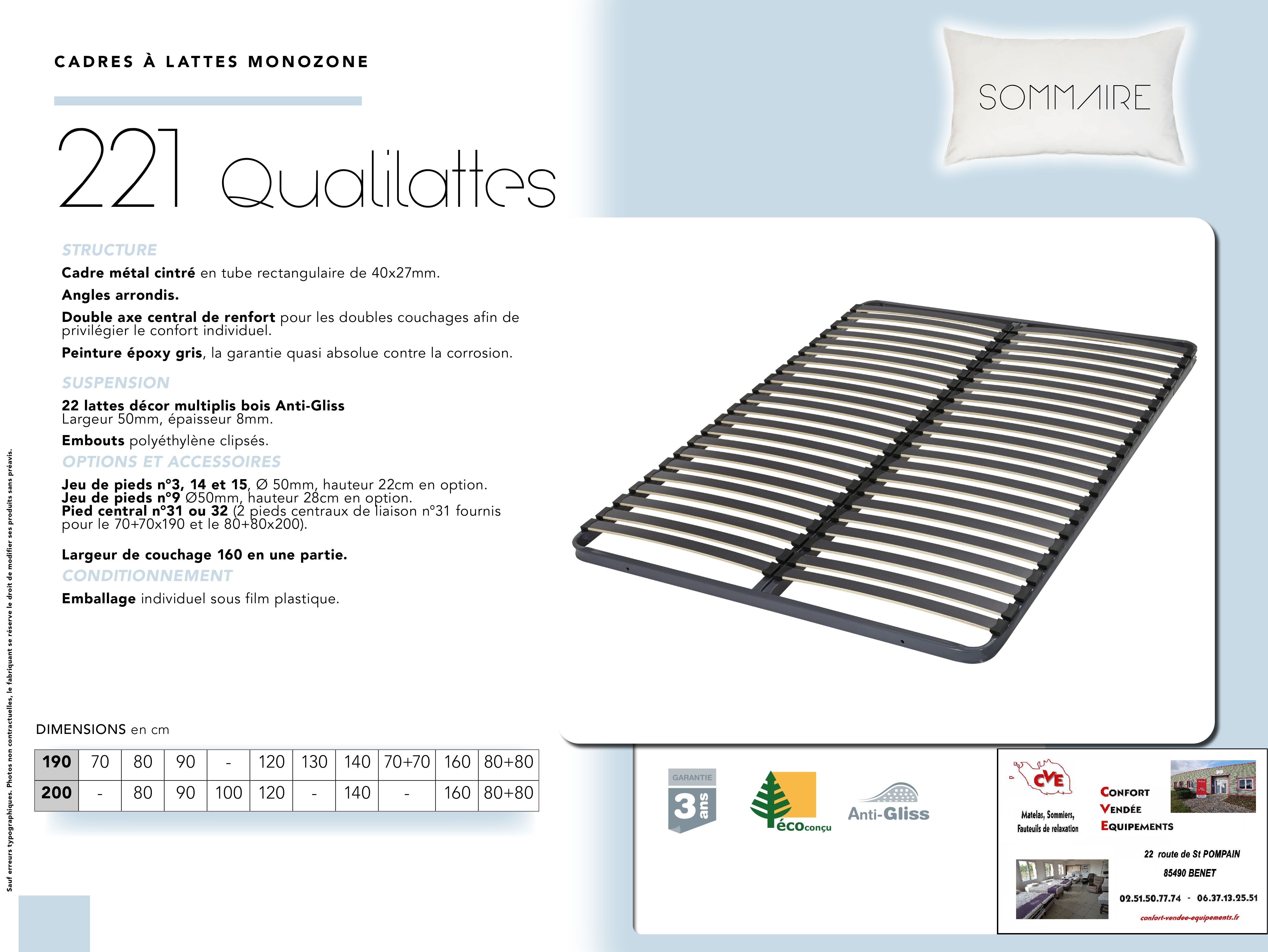 11 modèles : de 70/190 cm à 160/200 cm (Voir fiches en photos)