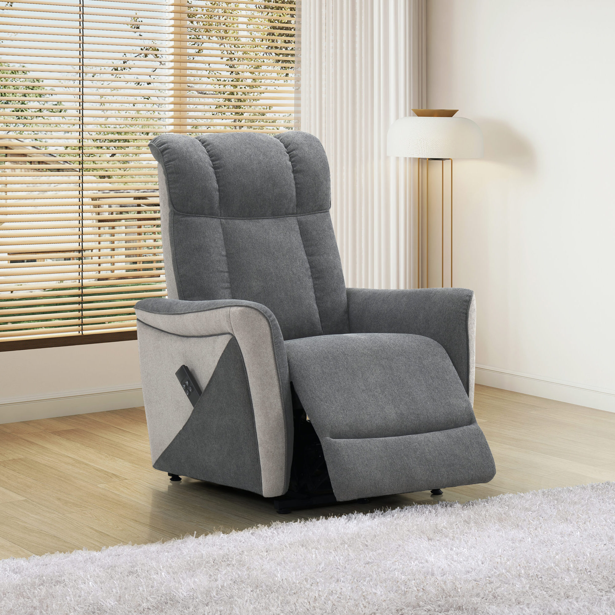 Fauteuil releveur, bi-moteur, microfibre ("velours ras"), adapté aux personnes à forte corpulence.